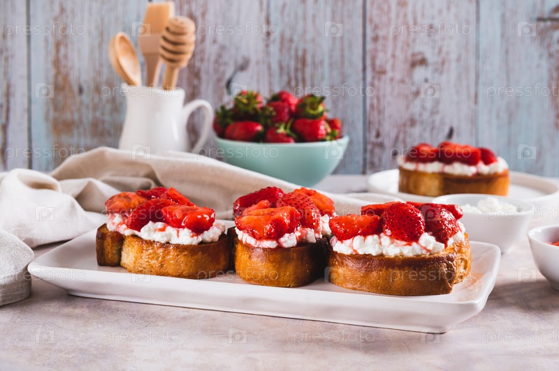 Аппетит brusquetta с рикотой и тушеными клубниками на тарелке на столе