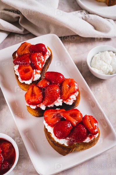 Сэндвичи со сливочным сыром и жареными клубниками на тарелке на столе вертикальный вид