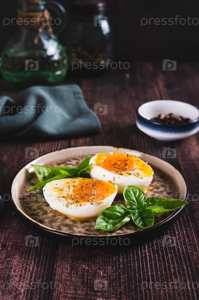 Мягко вареное яйцо, разделенное пополам с пряностями и листьями базилика на тарелке на столе с вертикальным видом