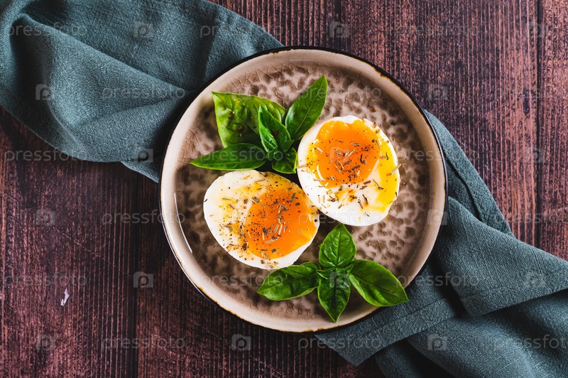 Закрытие яйца в мягком вареном виде, разделение пополам с пряностями и листьями базилика на тарелке с видом на стол