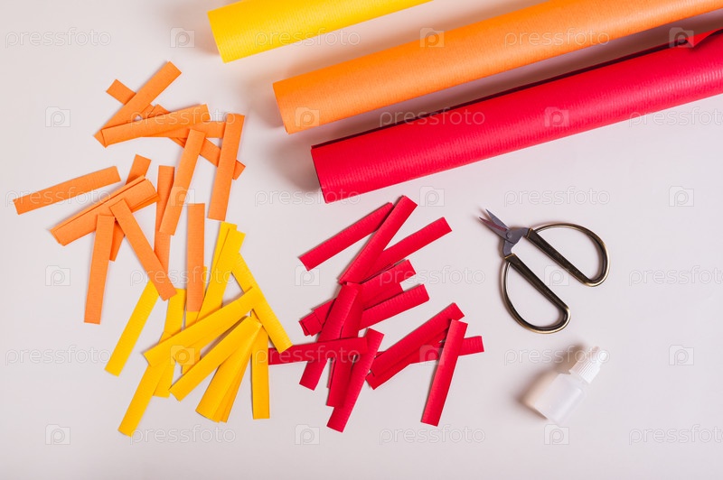 Полоски цветной бумаги, ножницы и клей, чтобы сделать бумажные гирлянды выглядеть сверху
