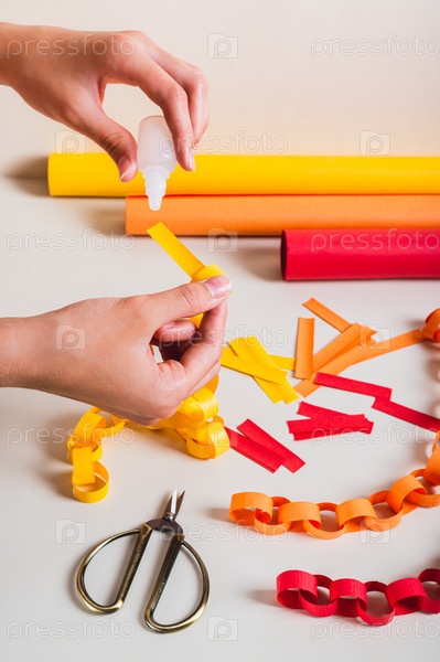 Руки девушки наливают клей на полоску бумаги, чтобы сделать бумажную цепочку выглядеть вертикально
