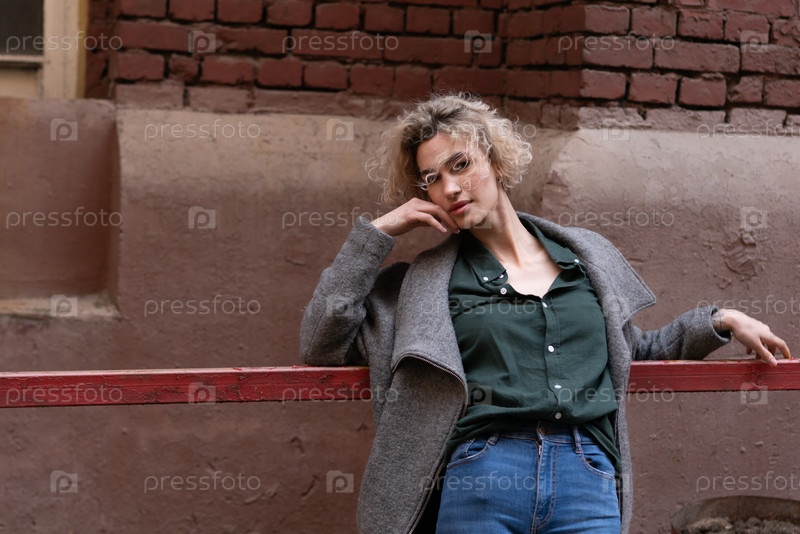 Красивая молодая женщина позирует снаружи в сером пальто