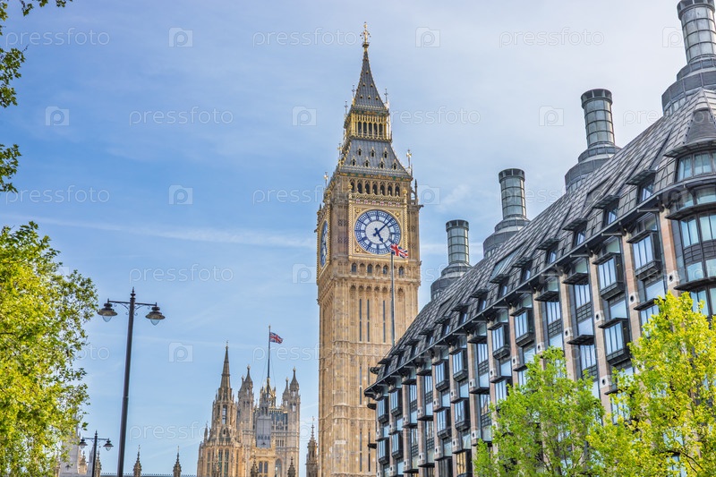 Биг-Бен и здания парламента, обрамленные свежей лиственницей и ярко-синим лондонским небом