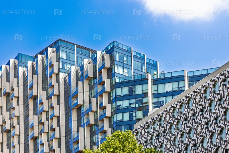 Стильные лондонские башни демонстрируют стекло, металл и вертикальные плавники среди яркого неба