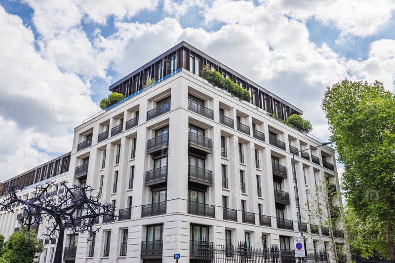 Элегантная белая квартира средней высоты с черными окнами, стеклянные балконы и растения на крыше против ярко-синего неба