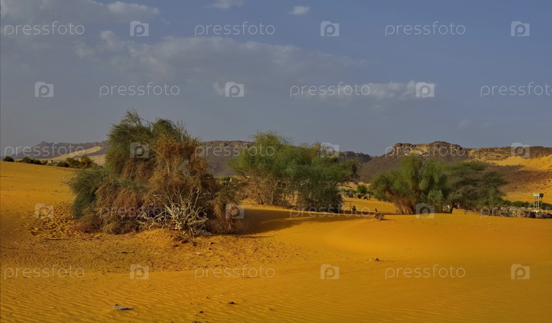 Западная Африка. Мавритания. Вид на пустынный песок с фрагментами кочевых лагерей местных племен вдоль юго-западных границ Сахары