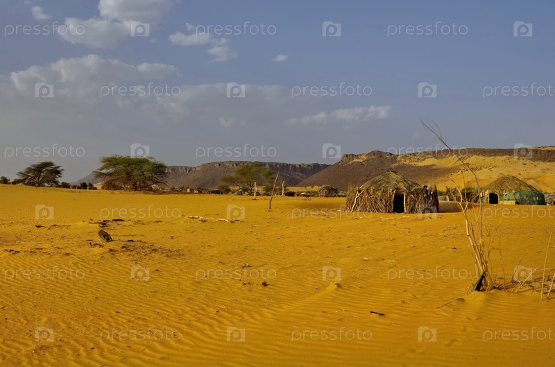 Западная Африка. Мавритания. Вид на пустынный песок с фрагментами кочевых лагерей местных племен вдоль юго-западных границ Сахары