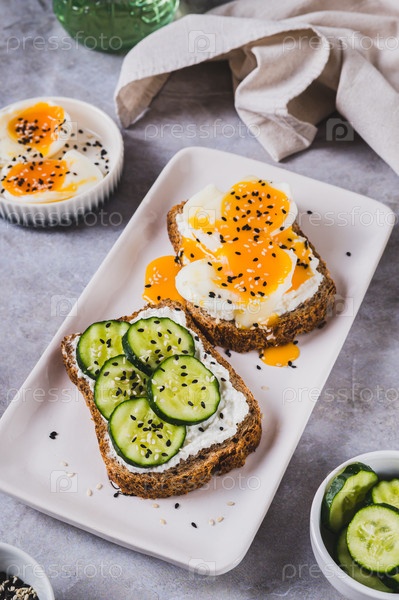 Зерновой хлеб с творогом, вареное яйцо и огурцы на тарелке на столе вертикальный вид