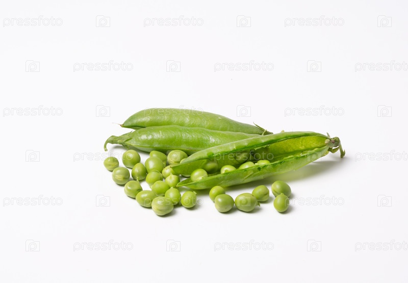 Горшки с свежим зеленым горохом на белом фоне. изолированные