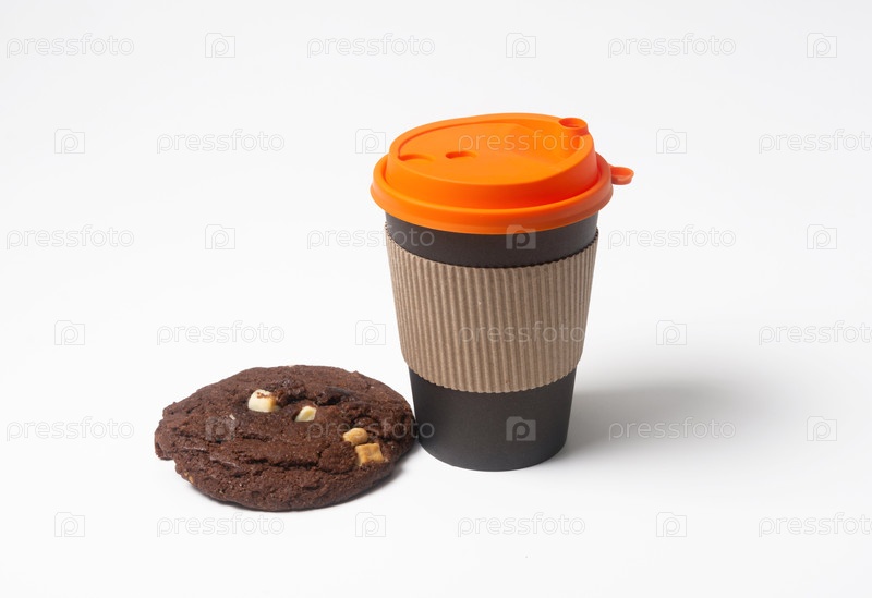 Кофе в бумажной чашке и шоколадные печенье ручной работы на белом фоне