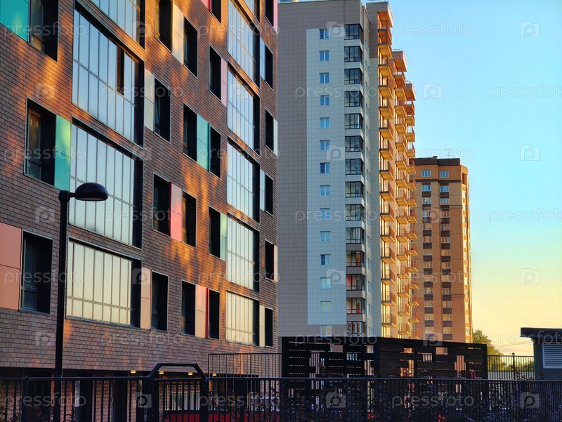 Многоэтажные дома на фоне заката и неба