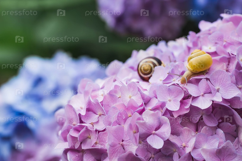Виноградная улитка (Helix pomatia) на цветущей гортензии. Садовый вредитель. Съедобная улитка. Наземный моллюск-гастропод семейства Helicidae