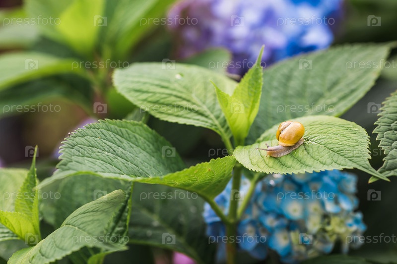 Виноградная улитка (Helix pomatia) на цветущей гортензии. Садовый вредитель. Съедобная улитка. Наземный моллюск-гастропод семейства Helicidae