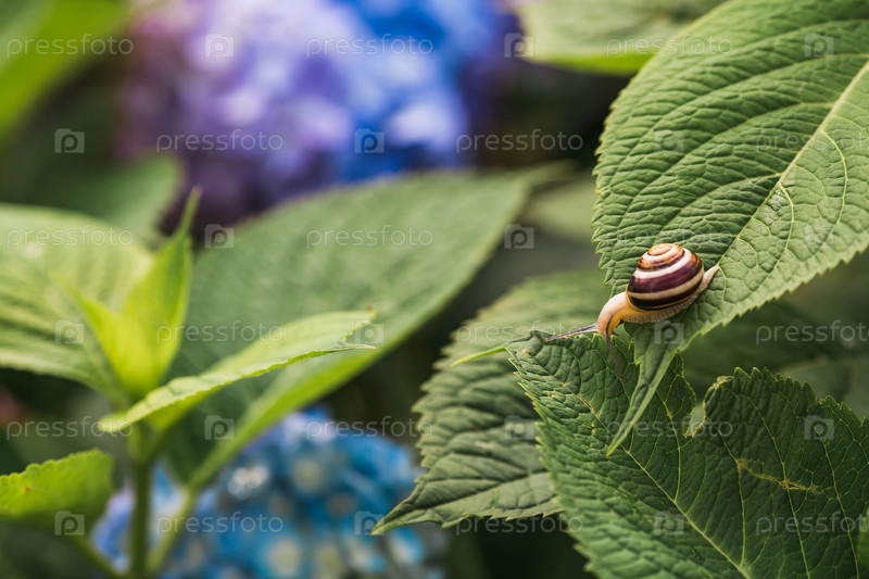 Виноградная улитка (Helix pomatia) на цветущей гортензии. Садовый вредитель. Съедобная улитка. Наземный моллюск-гастропод семейства Helicidae