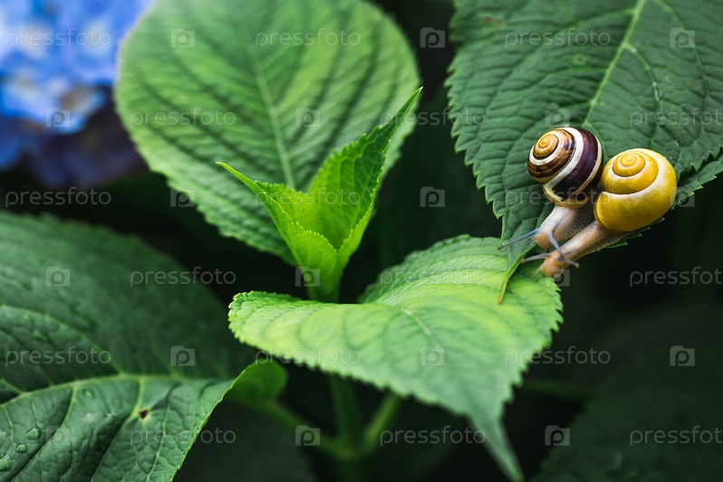 Виноградная улитка (Helix pomatia) на цветущей гортензии. Садовый вредитель. Съедобная улитка. Наземный моллюск-гастропод семейства Helicidae