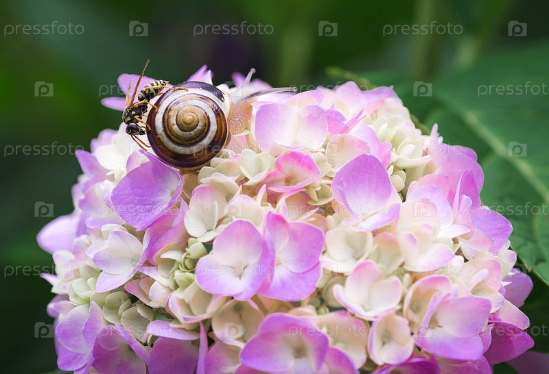 Виноградная улитка (Helix pomatia) на цветущей гортензии. Садовый вредитель. Съедобная улитка. Наземный моллюск-гастропод семейства Helicidae