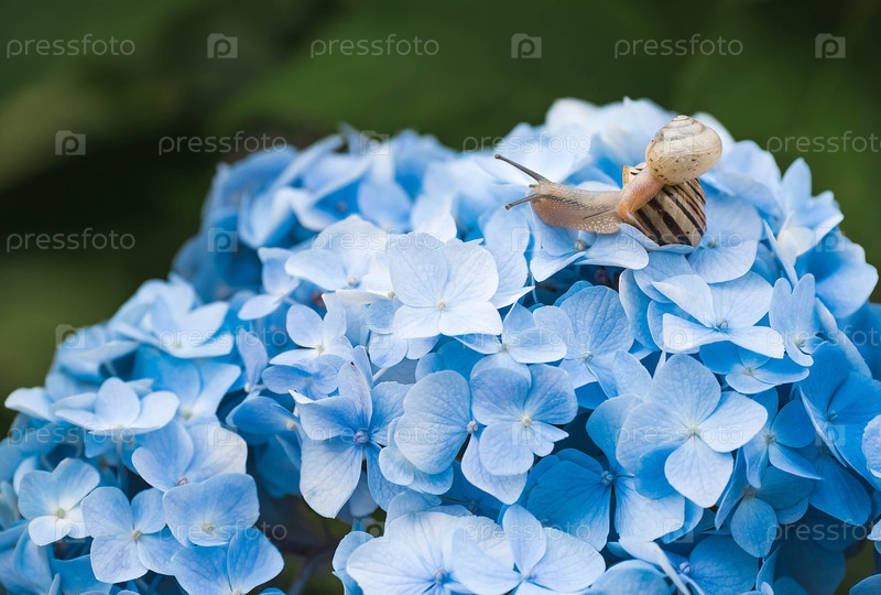 Виноградная улитка (Helix pomatia) на цветущей гортензии. Садовый вредитель. Съедобная улитка. Наземный моллюск-гастропод семейства Helicidae