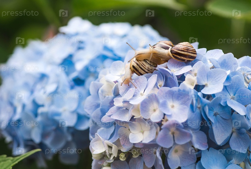 Виноградная улитка (Helix pomatia) на цветущей гортензии. Садовый вредитель. Съедобная улитка. Наземный моллюск-гастропод семейства Helicidae