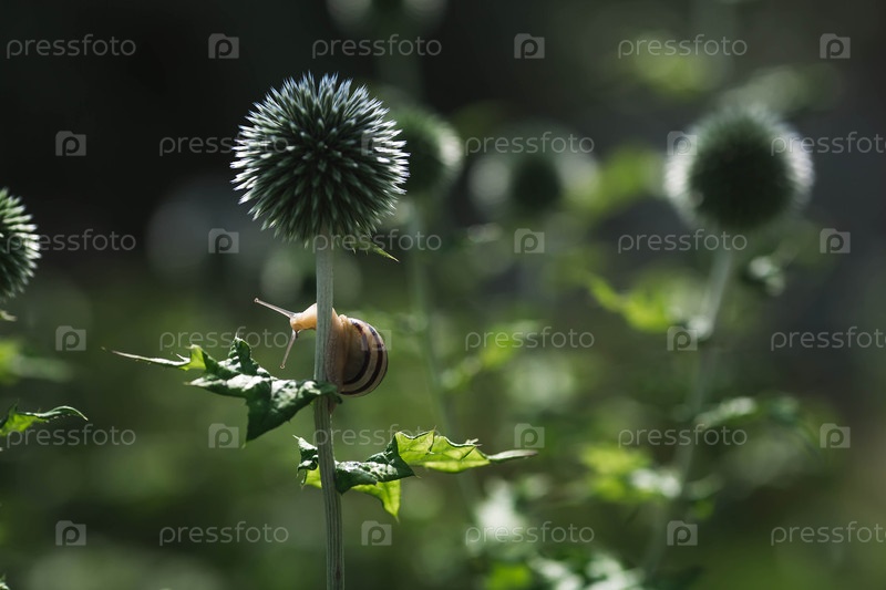 Виноградная улитка (Helix pomatia) на цветах сада. Садовый вредитель. Съедобная улитка. Наземный моллюск-гастропод семейства Helicidae