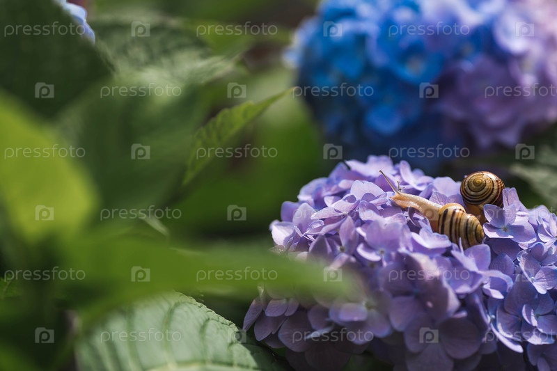 Виноградная улитка (Helix pomatia) на цветущей гортензии. Садовый вредитель. Съедобная улитка. Наземный моллюск-гастропод семейства Helicidae