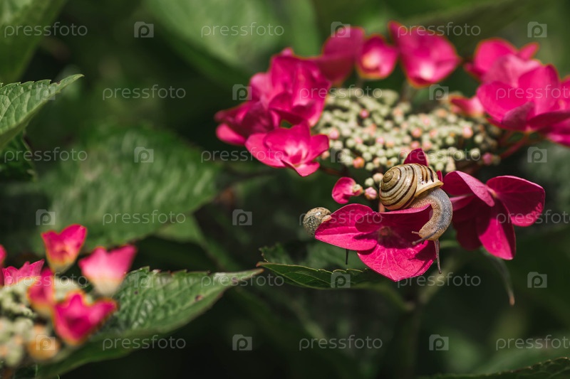 Виноградная улитка (Helix pomatia) на цветущей гортензии. Садовый вредитель. Съедобная улитка. Наземный моллюск-гастропод семейства Helicidae