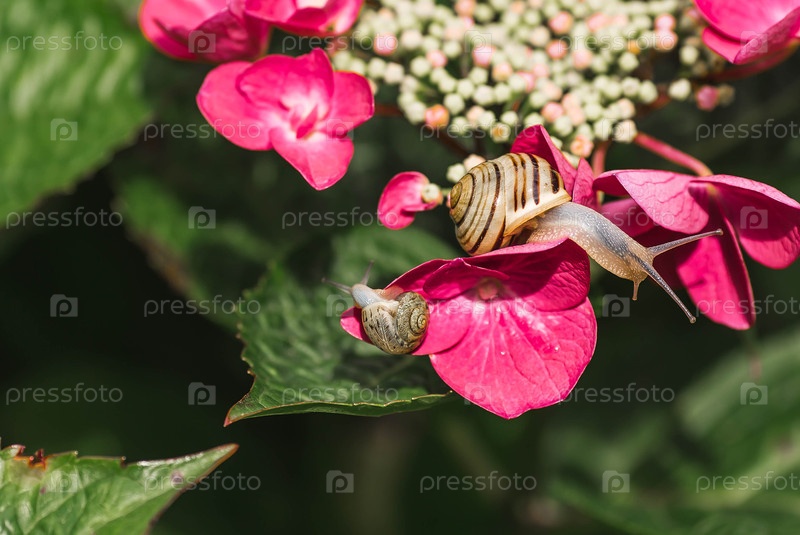 Виноградная улитка (Helix pomatia) на цветущей гортензии. Садовый вредитель. Съедобная улитка. Наземный моллюск-гастропод семейства Helicidae