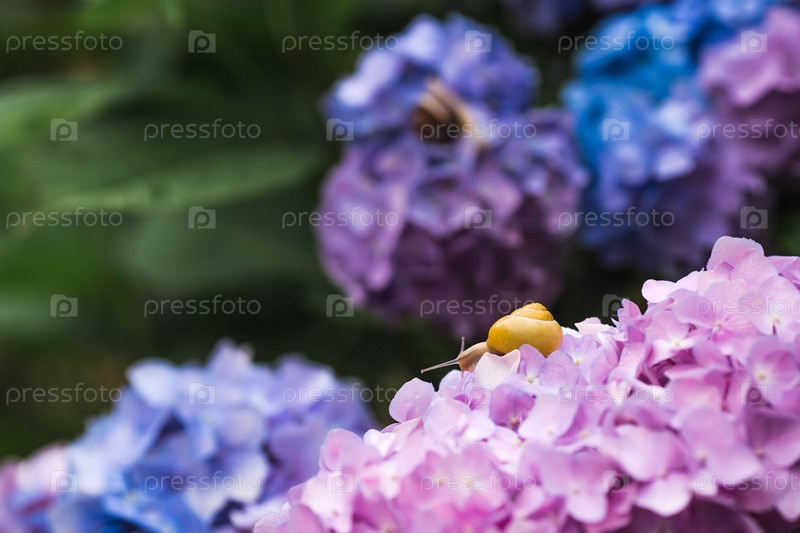 Виноградная улитка (Helix pomatia) на цветущей гортензии. Садовый вредитель. Съедобная улитка. Наземный моллюск-гастропод семейства Helicidae
