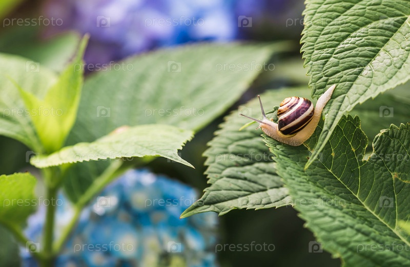 Виноградная улитка (Helix pomatia) на цветущей гортензии. Садовый вредитель. Съедобная улитка. Наземный моллюск-гастропод семейства Helicidae