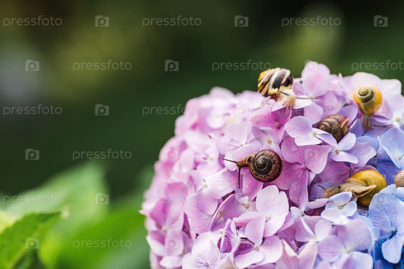 Виноградная улитка (Helix pomatia) на цветущей гортензии. Садовый вредитель. Съедобная улитка. Наземный моллюск-гастропод семейства Helicidae