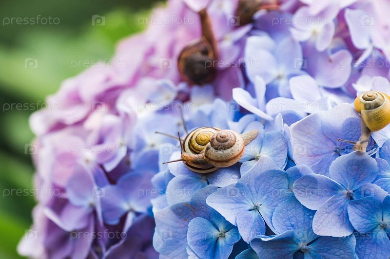 Виноградная улитка (Helix pomatia) на цветущей гортензии. Садовый вредитель. Съедобная улитка. Наземный моллюск-гастропод семейства Helicidae