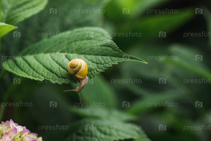 Виноградная улитка (Helix pomatia) на цветах сада. Садовый вредитель. Съедобная улитка. Наземный моллюск-гастропод семейства Helicidae