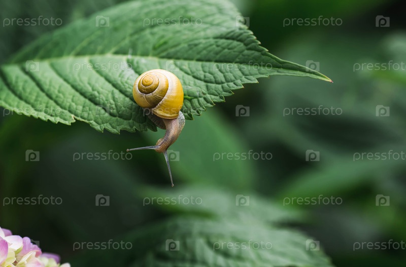 Виноградная улитка (Helix pomatia) на цветах сада. Садовый вредитель. Съедобная улитка. Наземный моллюск-гастропод семейства Helicidae