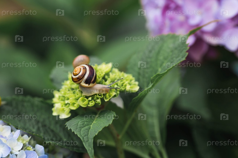 Виноградная улитка (Helix pomatia) на цветущей гортензии. Садовый вредитель. Съедобная улитка. Наземный моллюск-гастропод семейства Helicidae