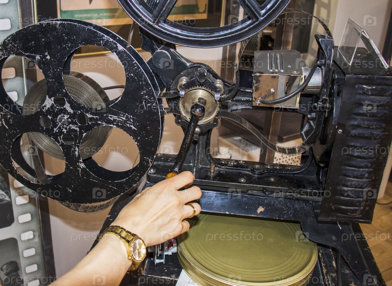 Женщина осматривает винтажный кинопроектор. ретро
