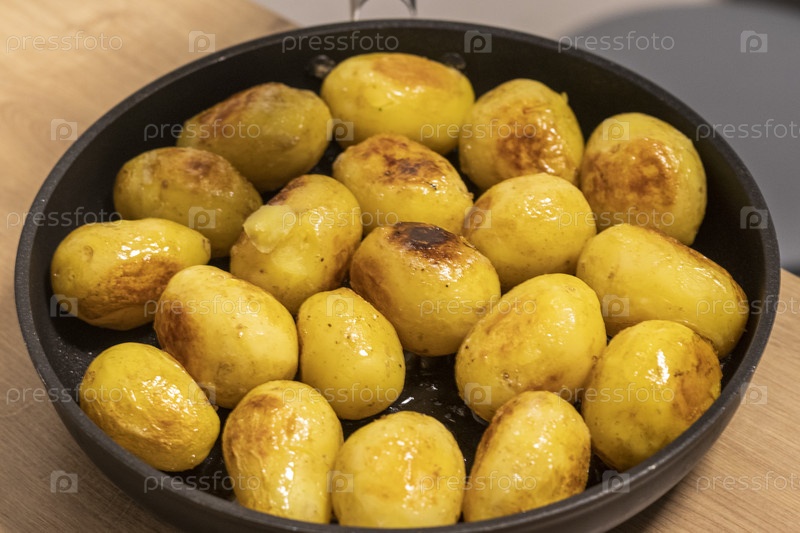 Молодые картофели были жарены в сковороде и посыпаны травами