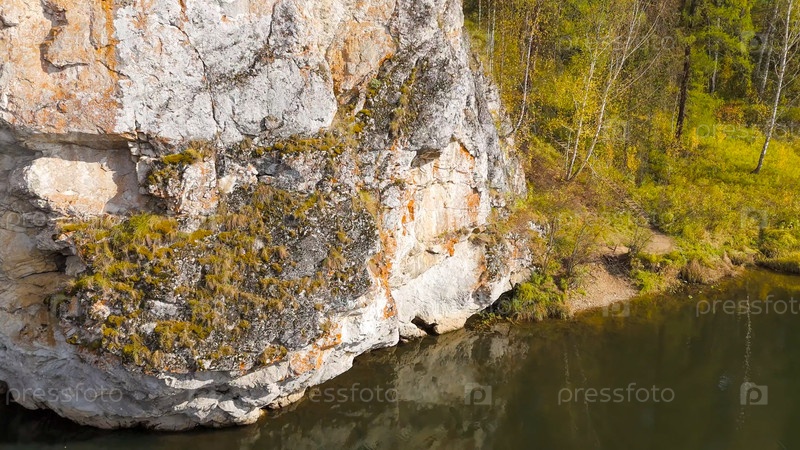Бажуково, Россия. Скала Писаника. Наскальные рисунки сделаны более 3000 лет назад. Падение. Река Серга. Оленьи ручьи - природный парк в лесистой местности, Aerial View