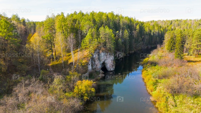 Бажуково, Россия. Каменная дыра или пьяный конь. Осенний пейзаж. Река Серга. Оленьи ручьи. Природный парк в лесистой местности, известной богатой флорой, вид с воздуха