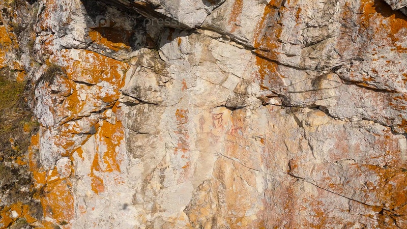 Бажуково, Россия. Скала Писаника. Наскальные рисунки сделаны более 3000 лет назад. Падение. Река Серга. Оленьи ручьи - природный парк в лесистой местности, Aerial View