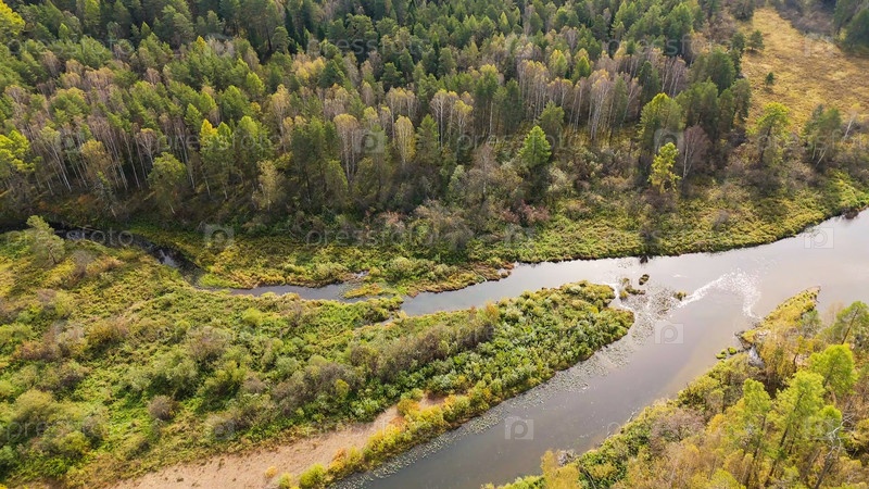 Бажуково, Россия. Осенний ландшафт. Река Серга. Рейндерные ручьи - природный парк в лесистой местности, известный своей богатой флорой, вид с воздуха
