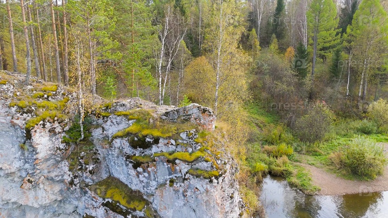 Бажуково, Россия. Фрогстоун. Осенний пейзаж. Река Серга. Рейндерные ручьи - природный парк в лесистой местности, известный своей богатой флорой, вид с воздуха