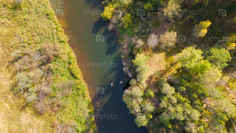Бажуково, Россия. Осенний ландшафт. Река Серга. Оленьи ручьи. Природный парк в лесистой местности, известной богатой флорой, вид с воздуха