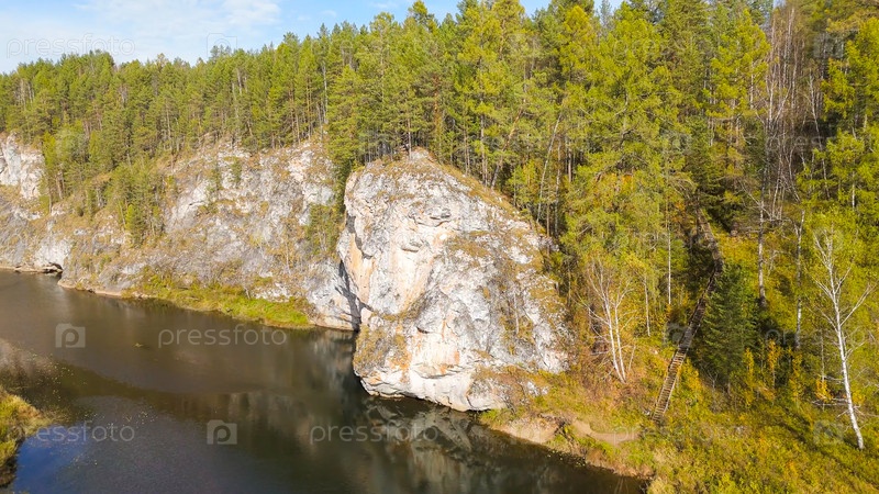 Бажуково, Россия. Скала Писаника. Наскальные рисунки сделаны более 3000 лет назад. Падение. Река Серга. Оленьи ручьи - природный парк в лесистой местности, Aerial View