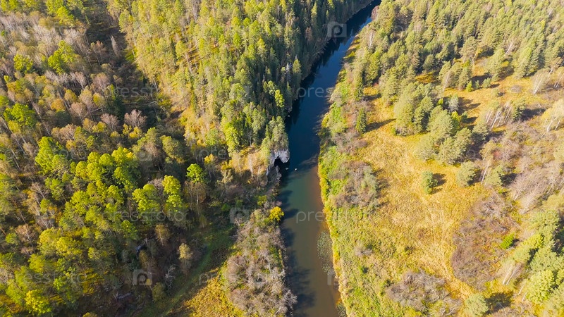Бажуково, Россия. Каменная дыра или пьяный конь. Осенний пейзаж. Река Серга. Оленьи ручьи. Природный парк в лесистой местности, известной богатой флорой, вид с воздуха