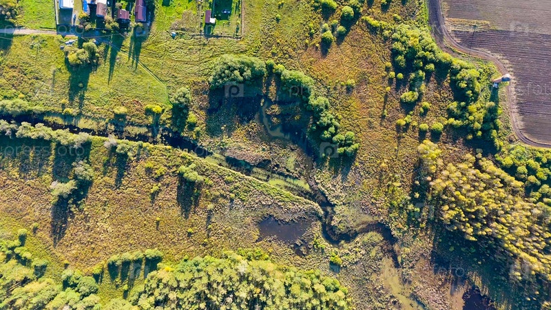 Екатеринбург, Россия.Болодный пруд, река и дома на окраине деревни.Вечернее время, ранняя осень, взгляд с воздуха