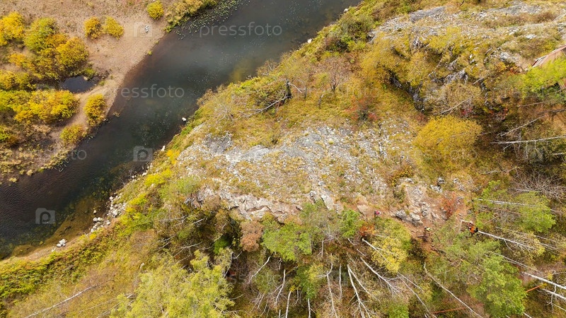 Бажуково, Россия. Светлая скала. Осенний пейзаж. Река Серга. Рейндерные ручьи - природный парк в лесистой местности, известный своей богатой флорой, вид с воздуха