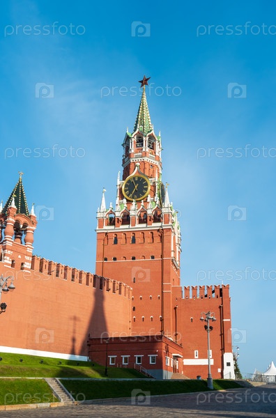 Спасская башня Московского Кремля на Красной площади. весеннее солнечное утро