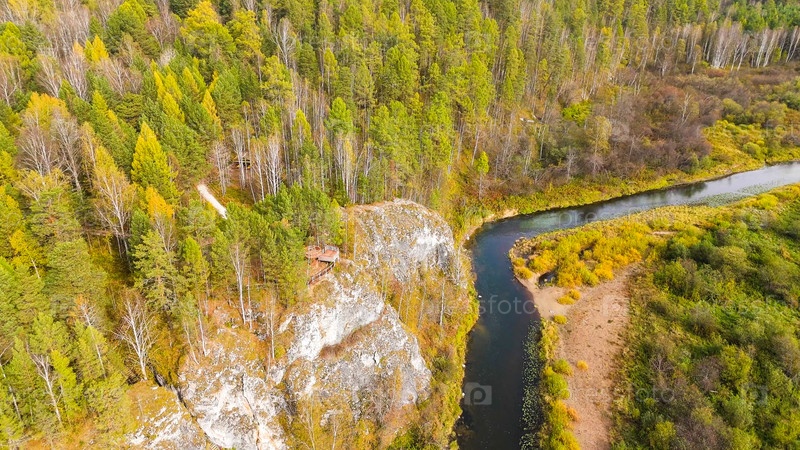 Бажуково, Россия. Светлая скала. Осенний пейзаж. Река Серга. Рейндерные ручьи - природный парк в лесистой местности, известный своей богатой флорой, вид с воздуха