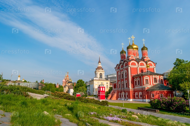 Москва, Россия. собор иконы Божией Матери Знаки. парк Зарядье. весеннее солнечное утро