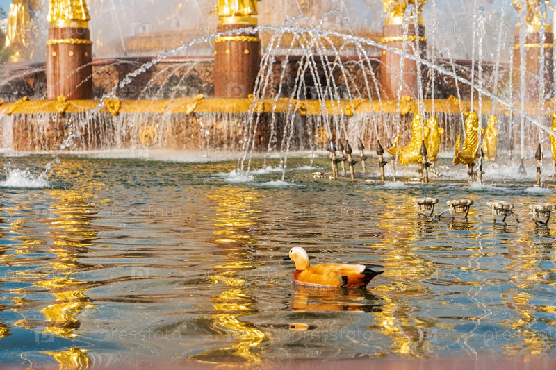 Москва, Россия. char плавает в фонтане Фонтан дружбы народов Выставка достижений народного хозяйства (VDNKh)